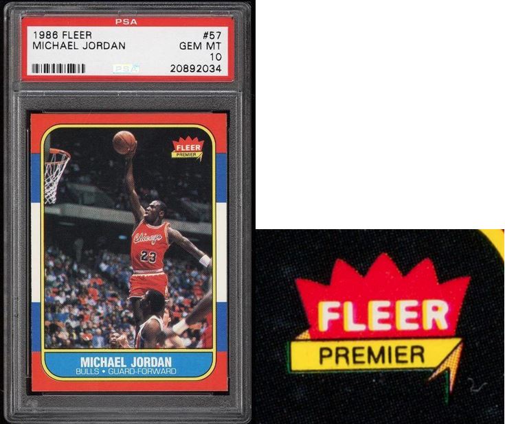 Another method to detect a counterfeit graded 1986 Fleer Michael Jordan is by examining the label or “flip” of the card. When these counterfeits are “produced”, the counterfeiter is cracking open a legitimate PSA holder, re-inserting a lower grade or counterfeit card and new homemade flip. The homemade flips will often contain the same certification number, barcode and grade, so simply checking the PSA database will not help in determining authenticity of the graded “card”. However, the homemade flips typically utilize very similar, yet slightly different fonts, character spacing and alignment than a PSA generated flip. By comparing these flip attributes to known good flips, one can also determine whether the graded card is counterfeit.
