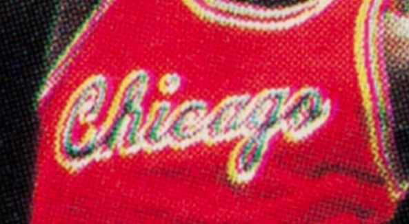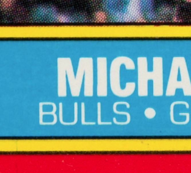 On the nameplate, there should be clear distinction between the background color (light blue) and the white font for Jordan’s name. The reprint will usually have a “fuzzy” transition. Below is a high-resolution scan of an authentic card.
