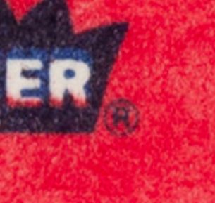There should be a very distinct transition between colors between the blue and red. The counterfeits commonly show a “fuzzy” transition. Below is a high-resolution scan of an authentic card.
