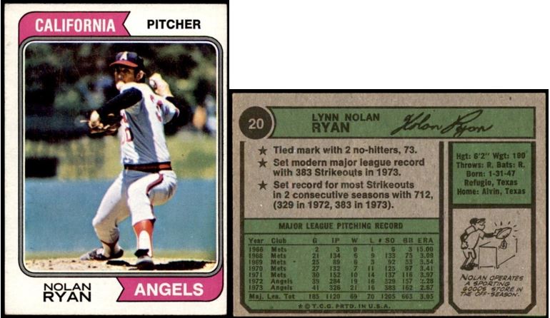 On the back of this Nolan Ryan card, you will see it lists his career statistics, starting in 1966 for the Mets and concluding in 1973 for the Angeles. One can conclude this card was printed in 1974, one year after the last year of statistics. Also, printed along the bottom is “T.C.G. PRTD IN U.S.A”, which stands for Topps Chewing Gum, so this card is a 1974 Topps Nolan Ryan.